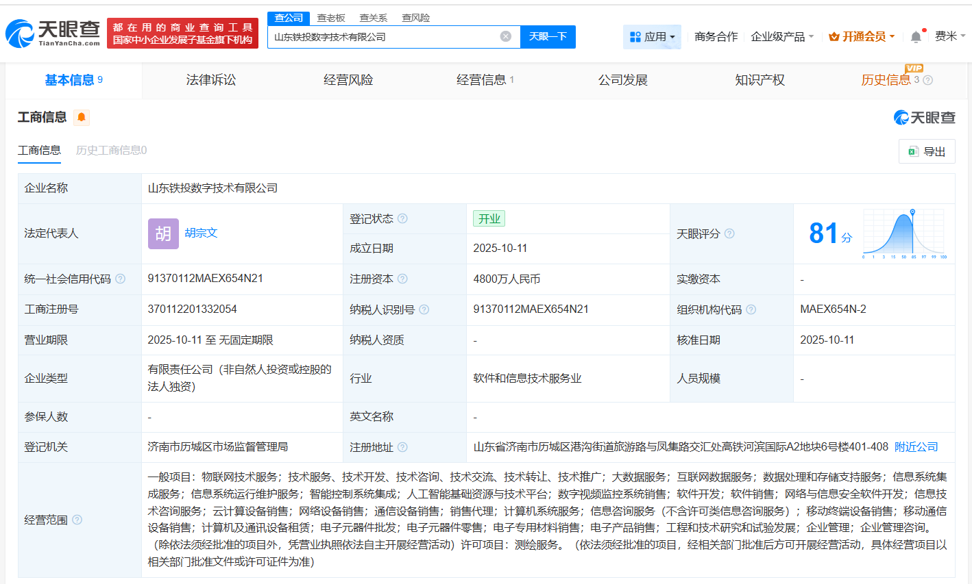 天眼查App显示,近日,山东铁投数字技术有限公司成立,法定代表人为胡宗文,注册资本4800万人民币,经营范围包括物联网技术服务、人工智能基础资源与技术平台、云计算设备销售等。股东信息显示,该公司由山东铁路投资控股集团有限公司全资持股。