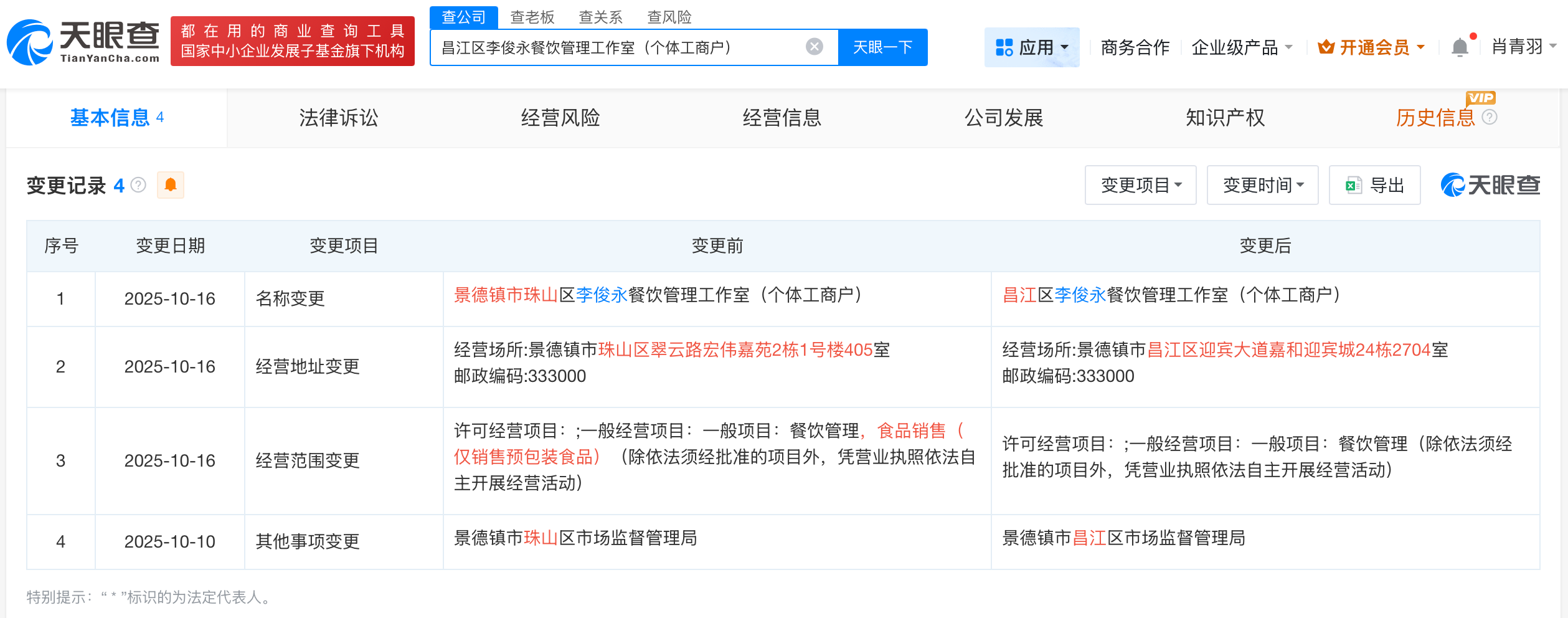 天眼查App显示,近日,景德镇市珠山区李俊永餐饮管理工作室(个体工商户)发生工商变更,企业名称变更为昌江区李俊永餐饮管理工作室(个体工商户),经营范围去除食品销售(仅销售预包装食品),同时经营地址也发生变更。