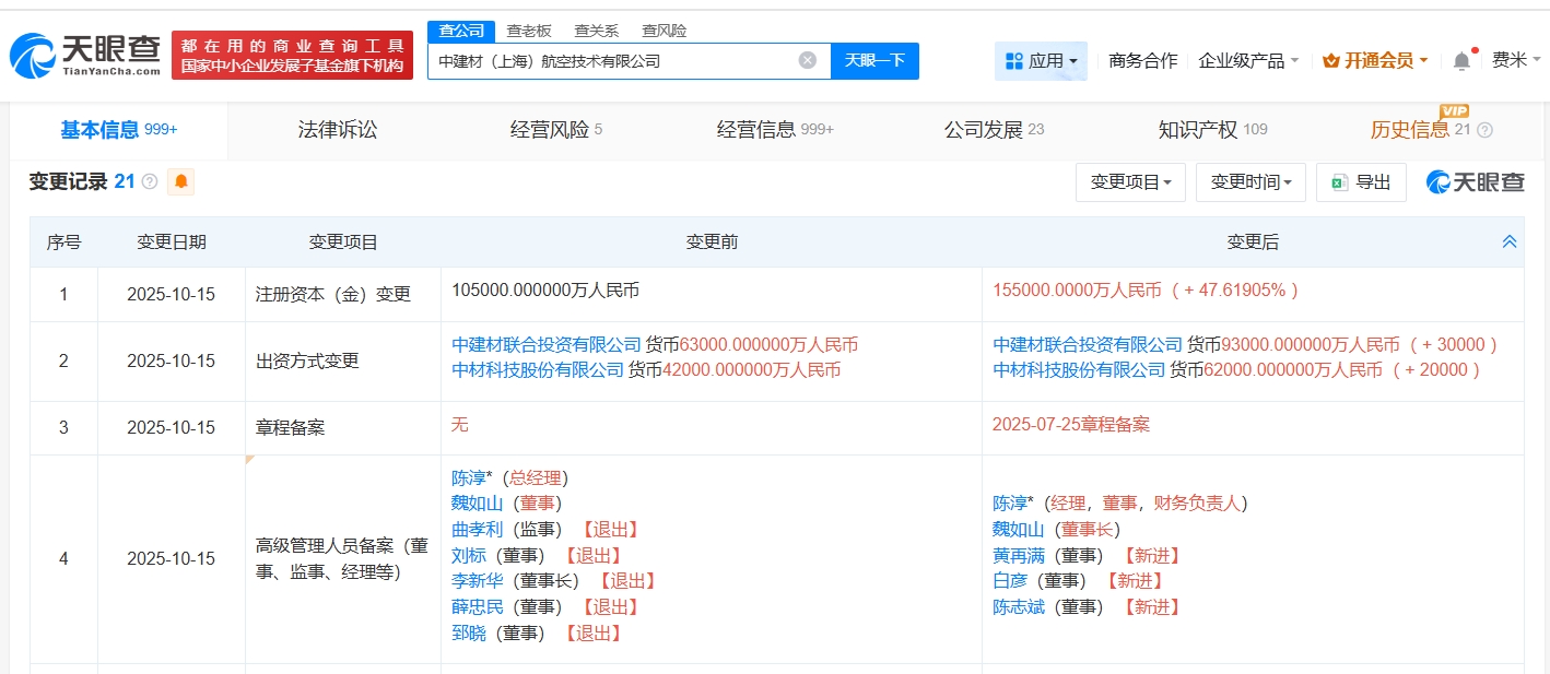 天眼查App显示,近日,中建材(上海)航空技术有限公司发生工商变更,注册资本由10.5亿人民币增至15.5亿人民币,增幅约48%,同时多位高管发生变更。