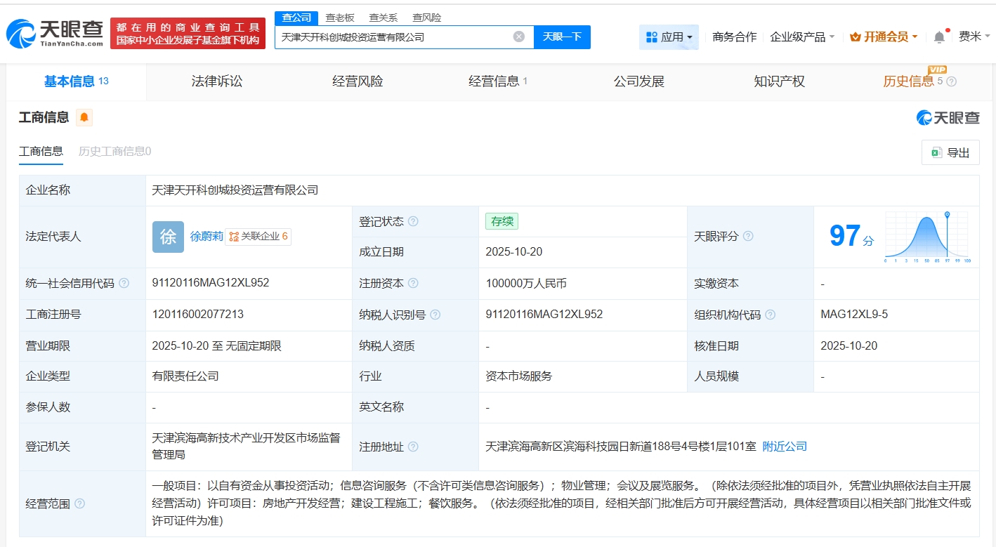 天眼查App显示,近日,天津天开科创城投资运营有限公司成立,法定代表人为徐蔚莉,注册资本10亿人民币,经营范围包括以自有资金从事投资活动、信息咨询服务、物业管理等。股东信息显示,该公司由天津海泰控股集团有限公司、天津泰达投资控股(集团)有限公司共同持股。