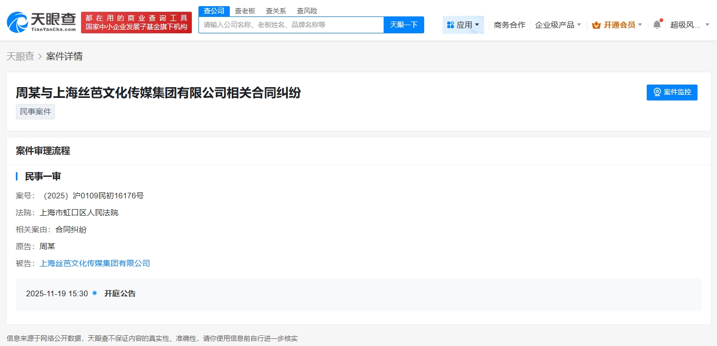 天眼查天眼风险信息显示,近日,上海丝芭文化传媒集团有限公司新增2条开庭公告,原告分别为周诗雨、王奕,案由均为合同纠纷,上述案件将分别于11月19日、11月24日在上海市虹口区人民法院开庭审理。