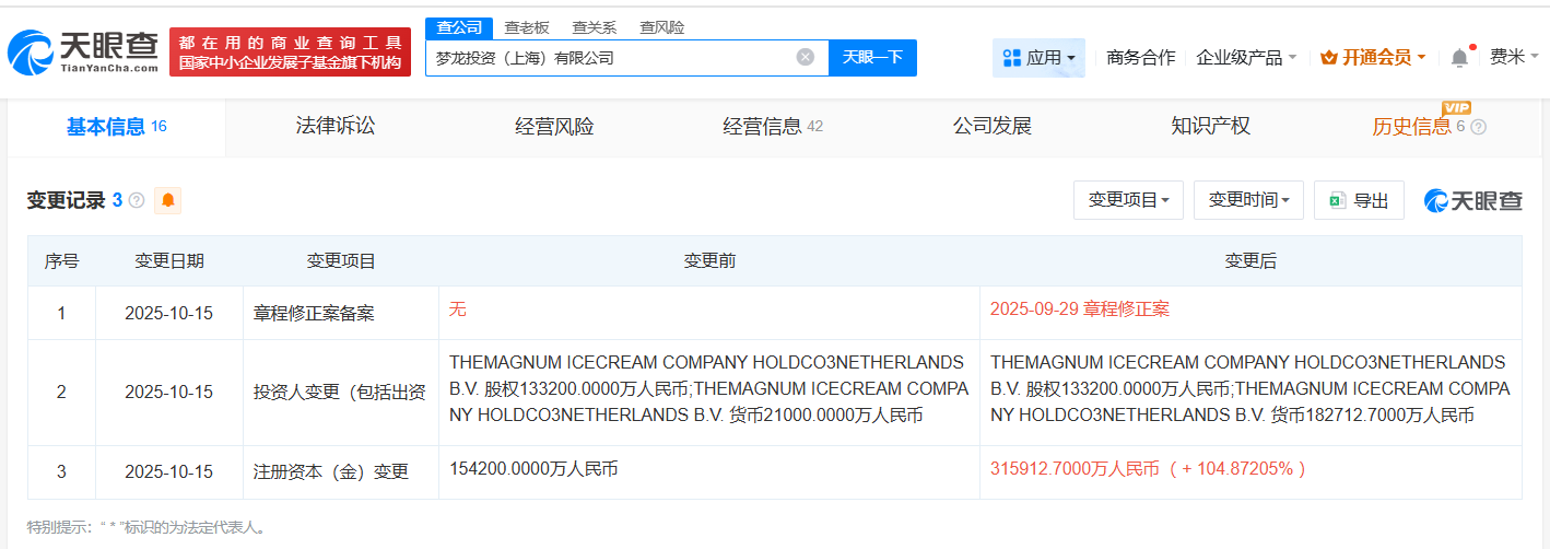 该公司成立于今年4月,法定代表人为LOH WAI FUNG,经营范围包括道路货物运输、生鲜乳道路运输、城市配送运输服务等,由梦龙冰淇淋关联公司THEMAGNUM ICECREAM COMPANY HOLDCO3NETHERLANDS B.V.全资持股。