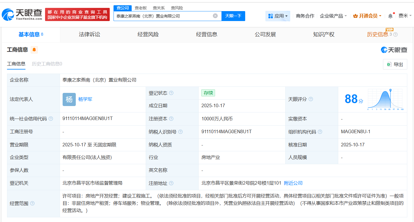 天眼查App显示,近日,泰康之家燕南(北京)置业有限公司成立,法定代表人为杨学军,注册资本1亿人民币,经营范围包括房地产开发经营、建设工程施工、非居住房地产租赁等,由泰康人寿保险有限责任公司全资持股。