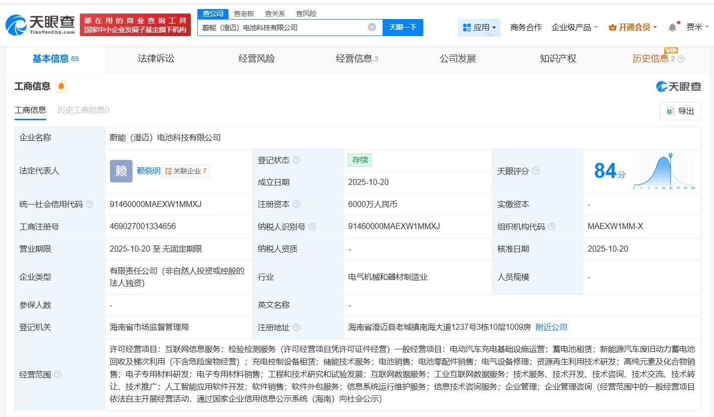 天眼查App显示,近日,蔚能(澄迈)电池科技有限公司成立,法定代表人为赖晓明,注册资本6000万人民币,经营范围包括电动汽车充电基础设施运营、蓄电池租赁、新能源汽车废旧动力蓄电池回收及梯次利用等。股东信息显示,该公司由武汉蔚能电池资产有限公司全资持股。