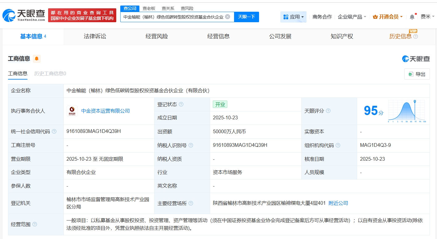 天眼查App显示,近日,中金榆能(榆林)绿色低碳转型股权投资基金合伙企业(有限合伙)成立,执行事务合伙人为中金资本运营有限公司,出资额5亿人民币,经营范围为以私募基金从事股权投资、投资管理、资产管理等活动,以自有资金从事投资活动,由陕西榆林能源集团有限公司、中金资本运营有限公司共同出资。