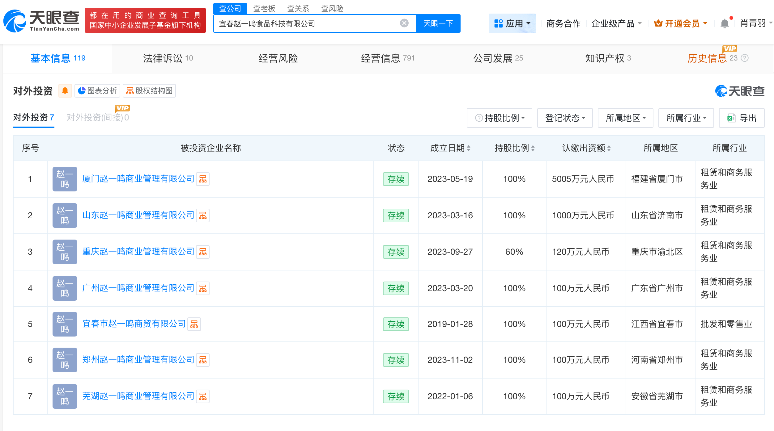 变更记录显示,今年2月,该公司发生工商变更,注册资本由约115.7万人民币减至约101.6万人民币。对外投资信息显示,该公司对外投资7家企业,包括厦门赵一鸣商业管理有限公司、山东赵一鸣商业管理有限公司等。