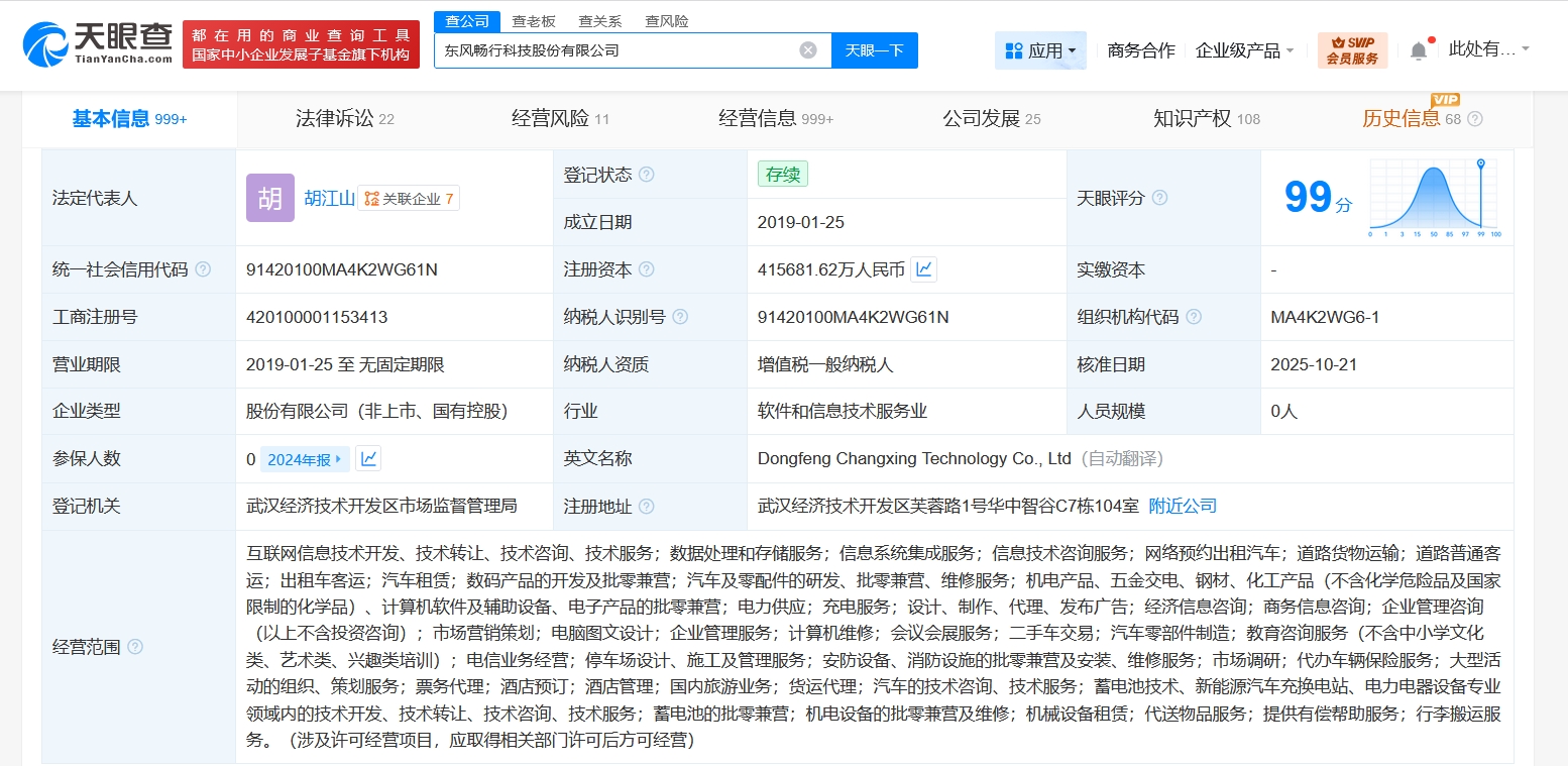 该公司成立于2019年1月,法定代表人为胡江山,经营范围含互联网信息技术开发、技术转让、技术咨询、技术服务,数据处理和存储服务,信息系统集成服务,信息技术咨询服务,网络预约出租汽车,道路货物运输等。股东信息显示,该公司由东风汽车集团股份有限公司等共同持股。