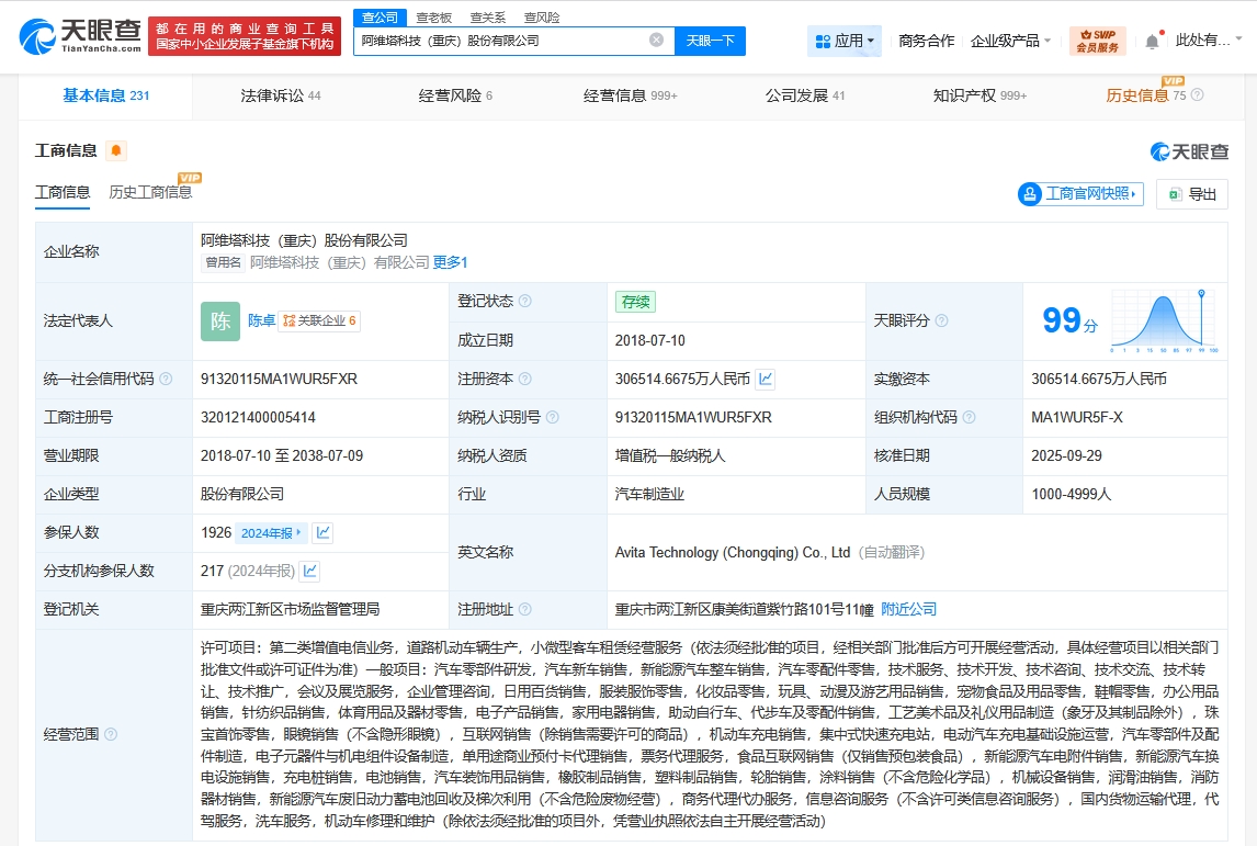 该公司成立于2018年7月,法定代表人为陈卓,注册资本约30.65亿人民币,经营范围含第二类增值电信业务、道路机动车辆生产、小微型客车租赁经营服务、汽车零部件研发、汽车新车销售、新能源汽车整车销售等。股东信息显示,该公司由长安汽车(000625)、宁德时代(300750)、重庆安渝私募股权投资基金合伙企业(有限合伙)等共同持股。