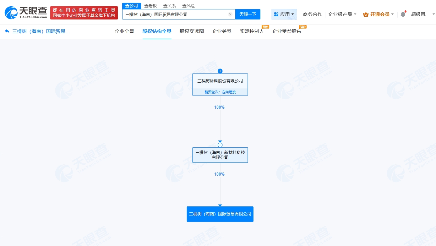 天眼查App显示,近日,三棵树(海南)国际贸易有限公司成立,法定代表人为洪圣源,注册资本5000万人民币,经营范围包括国内贸易代理、表面功能材料销售、贸易经纪等。股权全景穿透图显示,该公司由三棵树(603737)间接全资持股。