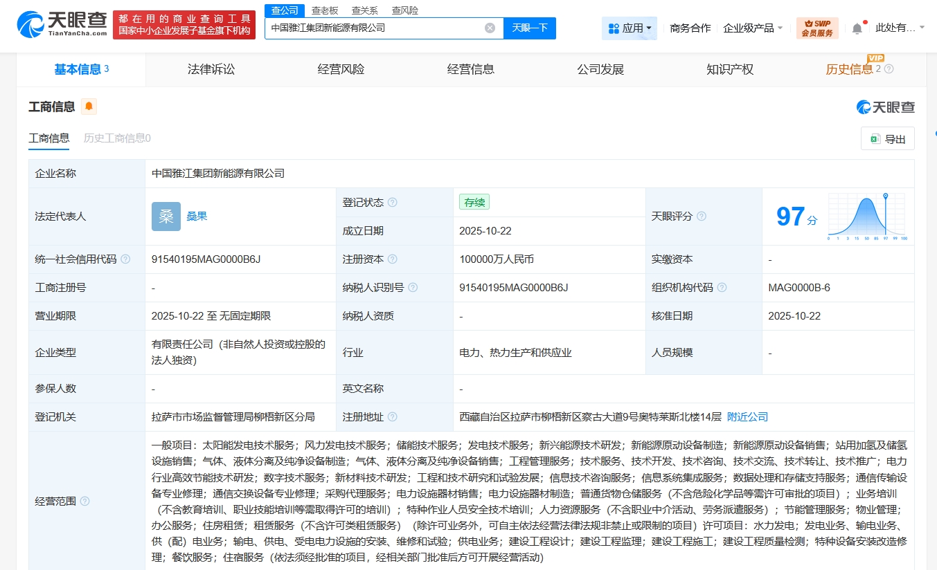 天眼查App显示,近日,中国雅江集团新能源有限公司成立,法定代表人为桑果,注册资本10亿人民币,经营范围含太阳能发电技术服务、风力发电技术服务、储能技术服务、发电技术服务、新兴能源技术研发、新能源原动设备制造、新能源原动设备销售、站用加氢及储氢设施销售、信息系统集成服务、数据处理和存储支持服务等。股东信息显示,该公司由中国雅江集团有限公司全资持股。