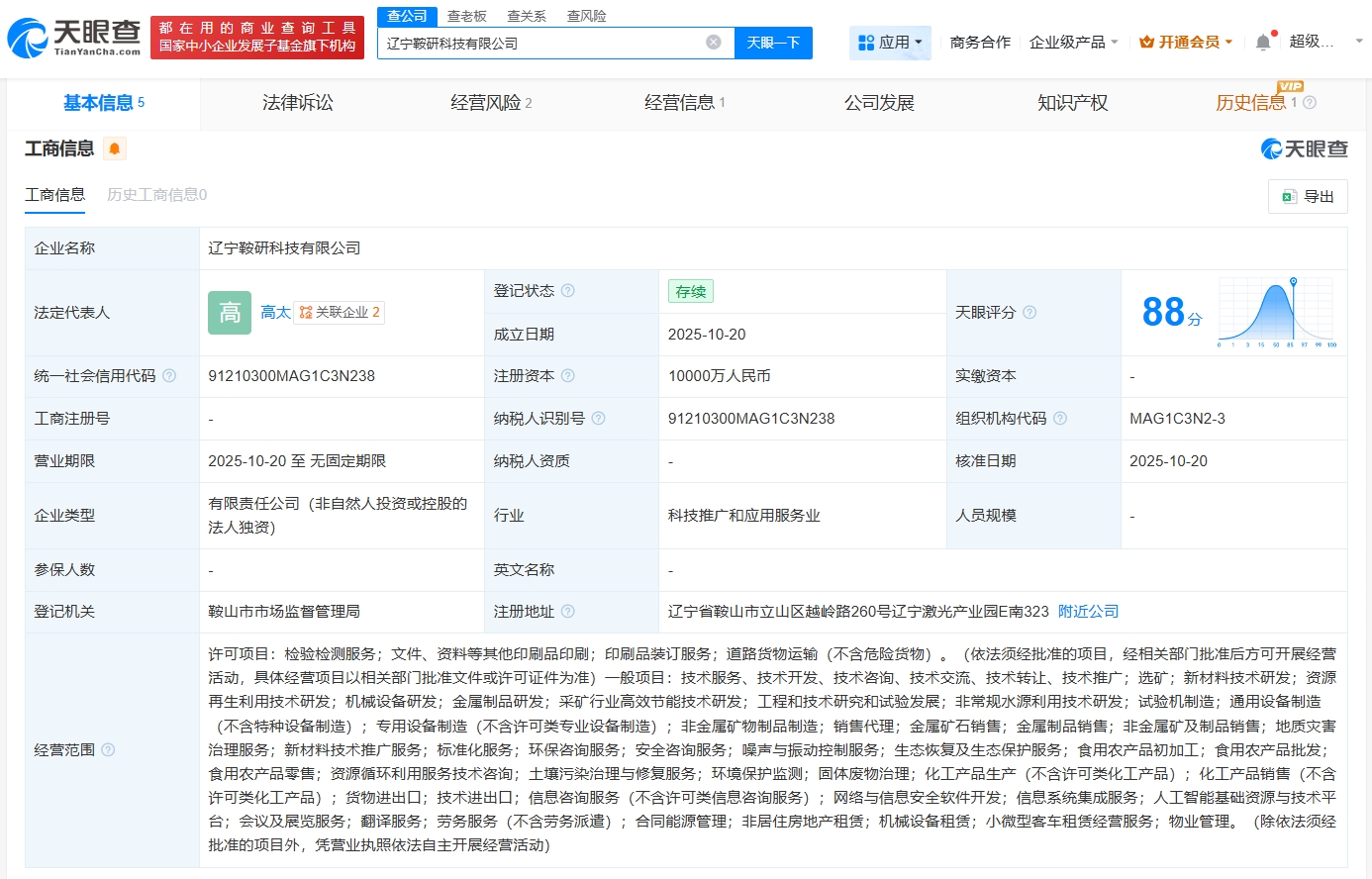天眼查App显示,近日,辽宁鞍研科技有限公司成立,法定代表人为高太,注册资本1亿人民币,经营范围包括新材料技术研发、资源再生利用技术研发、机械设备研发、金属制品研发等,由鞍钢集团矿业有限公司全资持股。