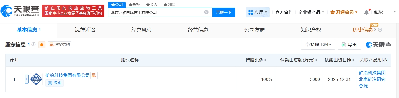 天眼查App显示,近日,北京北矿国际技术有限公司成立,法定代表人为李亚辉,注册资本5000万人民币,经营范围包括工程和技术研究和试验发展、进出口代理、国内贸易代理、贸易经纪等,由矿冶科技集团有限公司全资持股。