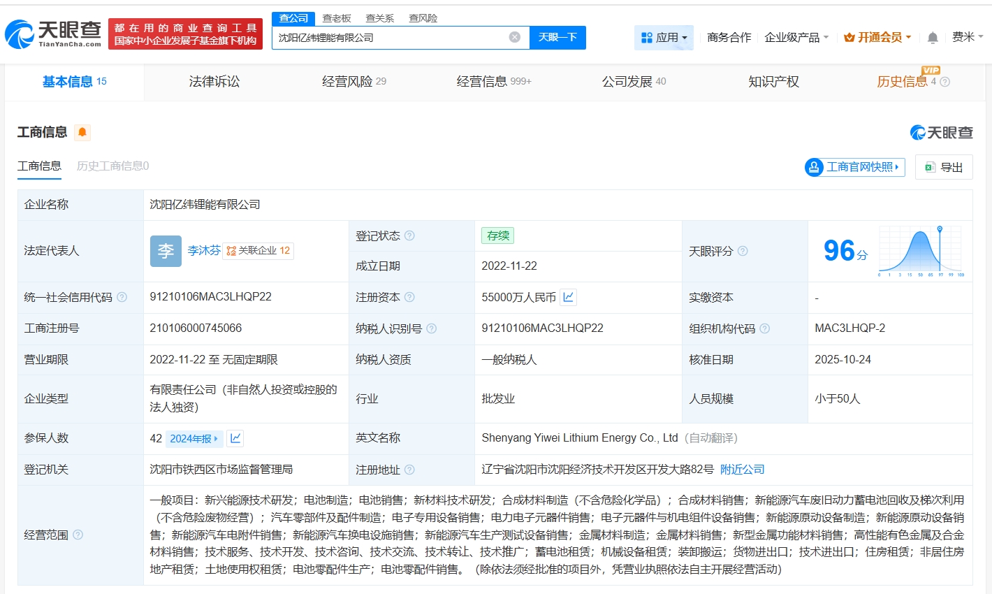 沈阳亿纬锂能有限公司成立于2022年11月,法定代表人为李沐芬,经营范围包括新兴能源技术研发、电池制造、电池销售等。股东信息显示,该公司由亿纬锂能(300014)全资持股。