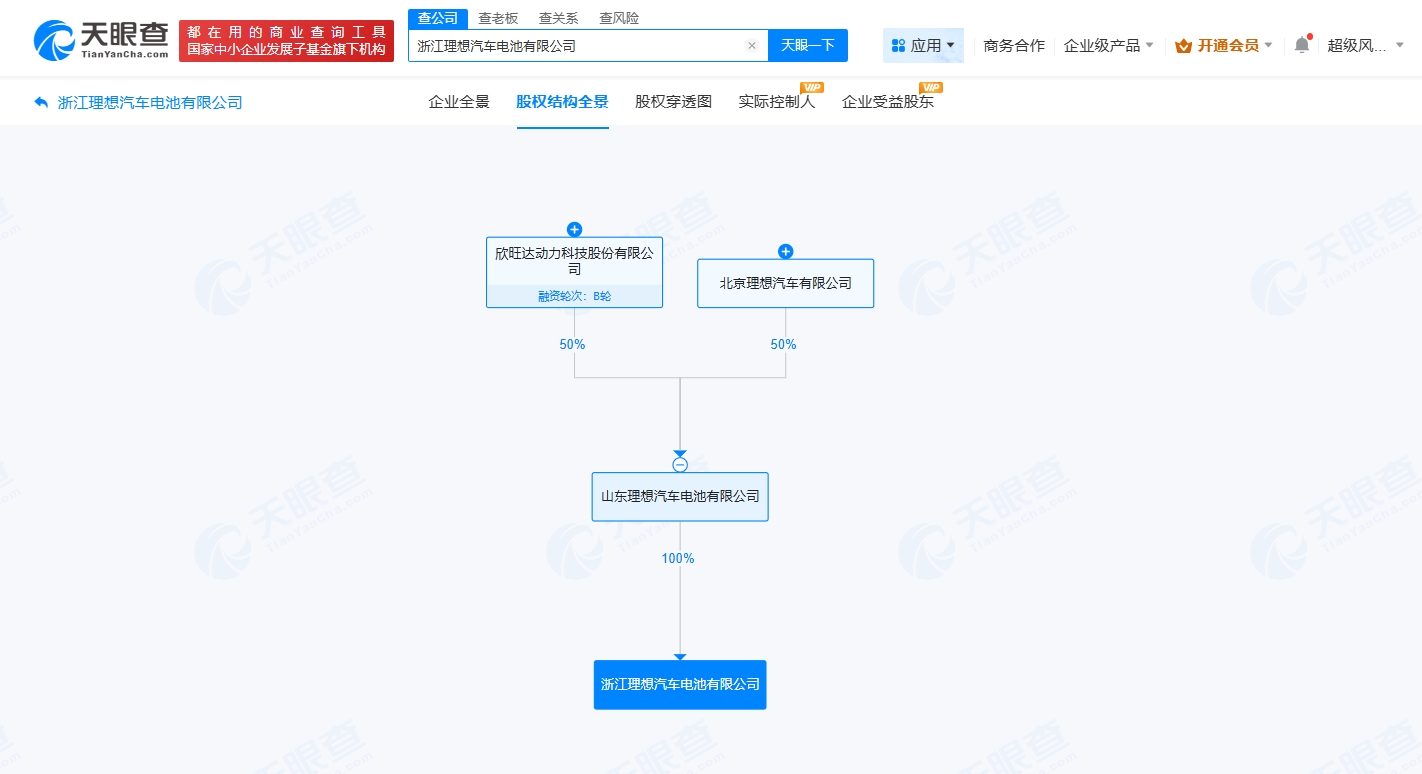 天眼查App显示,近日,浙江理想汽车电池有限公司成立,法定代表人为刘立国,注册资本7000万人民币,经营范围包括电池制造、电池销售、新兴能源技术研发、电动汽车充电基础设施运营、输配电及控制设备制造等。股权全景穿透图显示,该公司由山东理想汽车电池有限公司全资持股,后者由北京理想汽车有限公司、欣旺达动力科技股份有限公司共同持股。