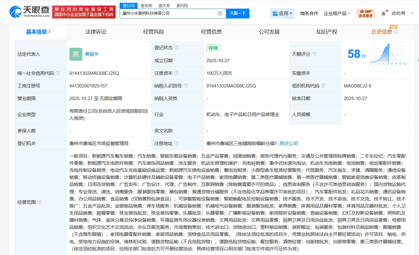 天眼查App显示,近日,惠州小米景明科技有限公司成立,法定代表人为黄振宇,注册资本100万人民币,经营范围含新能源汽车整车销售、汽车销售、智能车载设备销售、二手车经纪、汽车零配件零售、新能源汽车电附件销售、汽车装饰用品销售、机动车修理和维护、充电桩销售等,由小米景明科技有限公司全资持股。