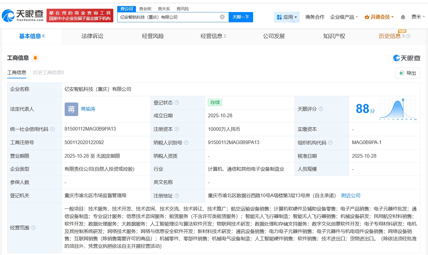 天眼查App显示,近日,亿安智航科技(重庆)有限公司成立,法定代表人为蒋瑜涛,注册资本1亿人民币,经营范围包括智能无人飞行器制造、智能无人飞行器销售、人工智能理论与算法软件开发等,由长安汽车投资(深圳)有限公司、亿航智能设备有限公司共同持股。