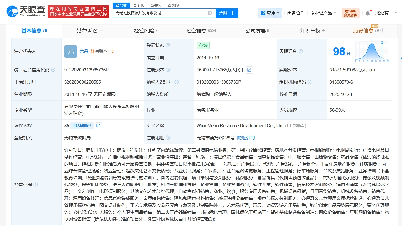 该公司成立于2014年10月,法定代表人为尤丹,经营范围含建设工程施工、建设工程设计、住宅室内装饰装修、电视剧制作、电视剧发行、广播电视节目制作经营、电影发行、广播电视视频点播业务、营业性演出、医护人员防护用品批发、企业管理咨询等,由无锡地铁集团有限公司全资持股。