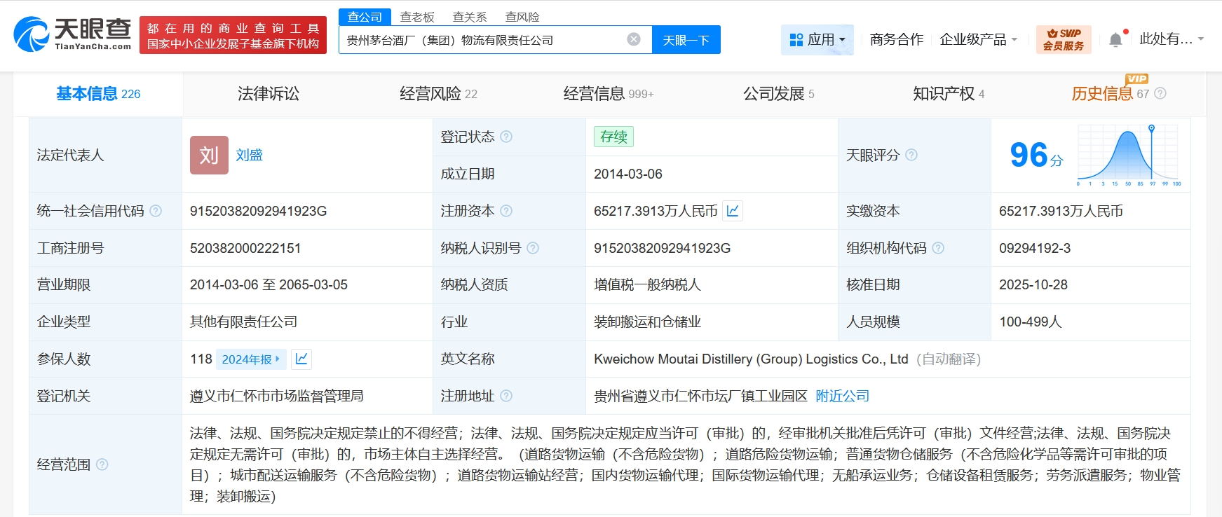 该公司成立于2014年3月,注册资本约6.5亿人民币,经营范围含道路货物运输、道路危险货物运输、普通货物仓储服务、城市配送运输服务、道路货物运输站经营、国内货物运输代理、无船承运业务、劳务派遣服务等。股东信息显示,该公司由中国贵州茅台酒厂(集团)有限责任公司、中国物流股份有限公司、仁怀酱酒(集团)有限责任公司共同持股。