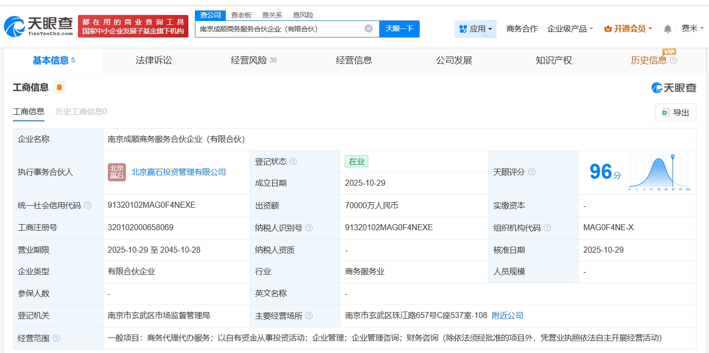 天眼查工商信息显示,近日,南京成顺商务服务合伙企业(有限合伙)成立,执行事务合伙人为北京赢石投资管理有限公司,出资额7亿人民币,经营范围包括商务代理代办服务、以自有资金从事投资活动、企业管理等。合伙人信息显示,该合伙企业由中信金融资产(02799.HK)、广州利信禾诚企业管理有限公司、北京赢石投资管理有限公司共同出资。