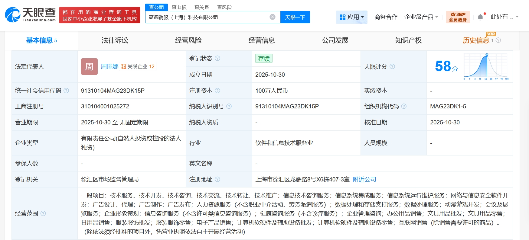 天眼查App显示,近日,高德销服(上海)科技有限公司成立,法定代表人为周琲娜,注册资本100万人民币,经营范围包括信息技术咨询服务、信息系统集成服务、信息系统运行维护服务、网络与信息安全软件开发、数据处理和存储支持服务、数据处理服务、动漫游戏开发、信息咨询服务等。股东信息显示,该公司由杭州高德云图科技有限公司全资持股。