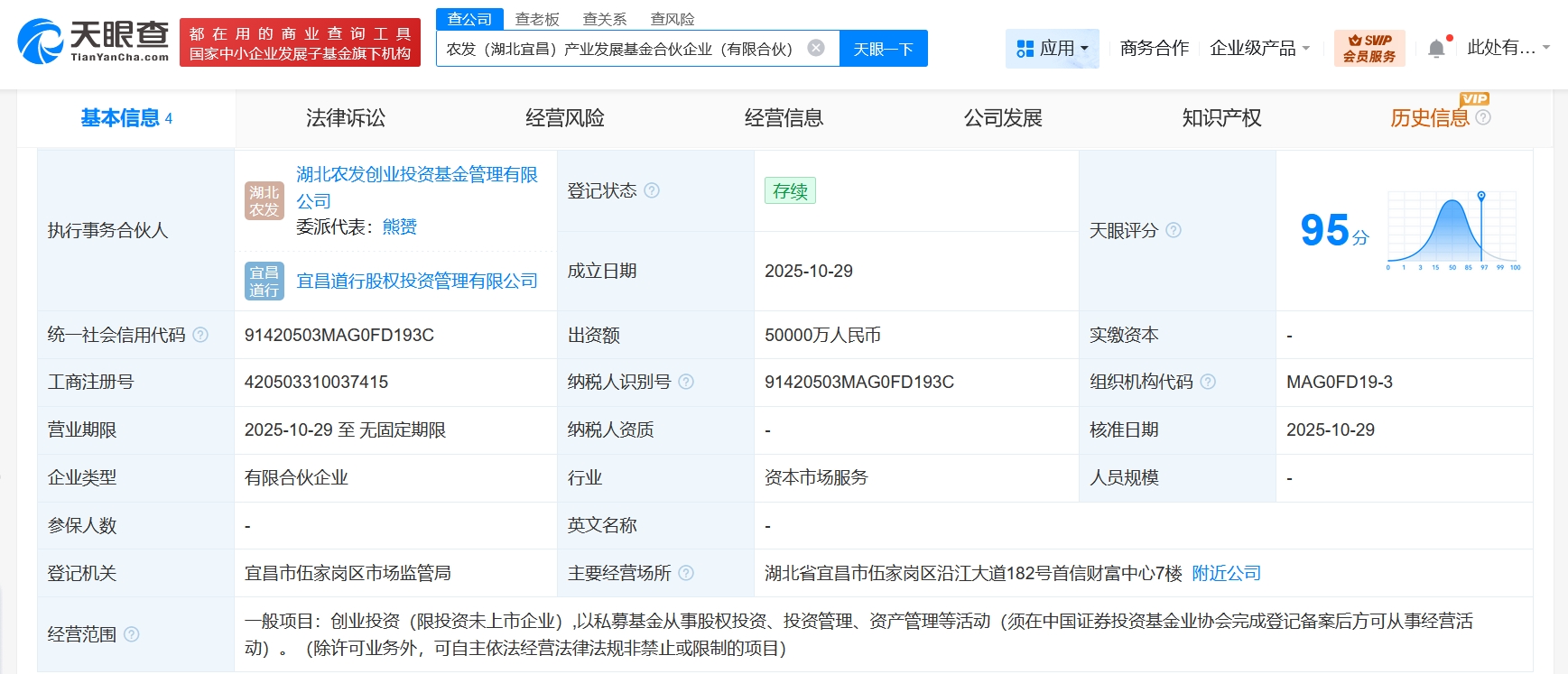 天眼查工商信息显示,近日,农发(湖北宜昌)产业发展基金合伙企业(有限合伙)成立,执行事务合伙人为湖北农发创业投资基金管理有限公司、宜昌道行股权投资管理有限公司,出资额5亿人民币,经营范围为创业投资,以私募基金从事股权投资、投资管理、资产管理等活动。合伙人信息显示,该基金由宜昌城发资本控股有限公司、湖北农发农业产业发展基金合伙企业(有限合伙)、宜昌道行股权投资管理有限公司、湖北农发创业投资基金管理有限公司共同出资。