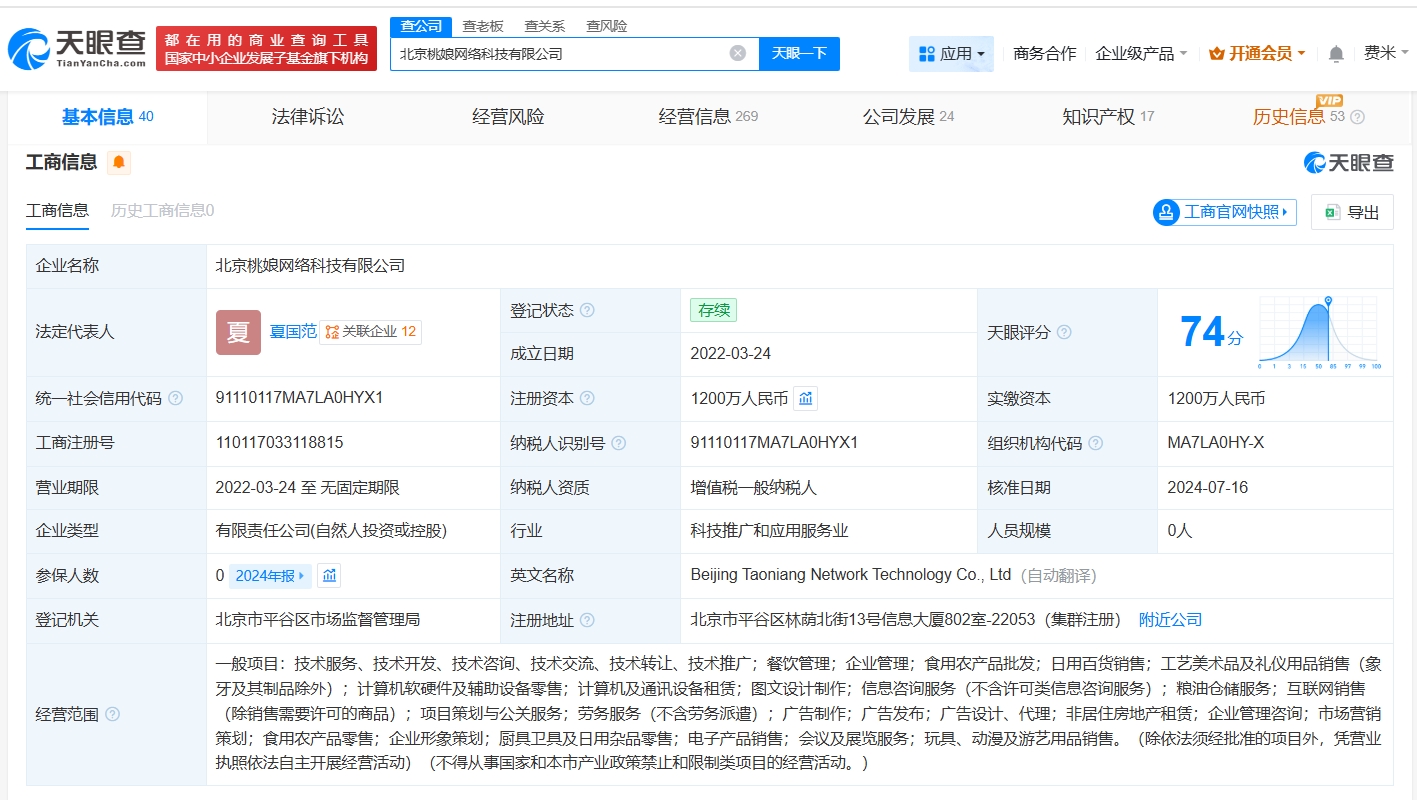 天眼查App显示,桃娘下饭小火锅关联公司北京桃娘网络科技有限公司成立于2022年3月,法定代表人为夏国范,注册资本1200万人民币,经营范围包括餐饮管理、企业管理、食用农产品批发等。股东信息显示,该公司由夏国范、樊建川共同持股。年报信息显示,该公司2024年参保人数为0。控制企业信息显示,该公司控制6家企业,包括凤呈祥餐饮管理(北京)有限公司、北京桃娘供应链管理有限公司、战釜餐饮管理(北京)有限公司等。