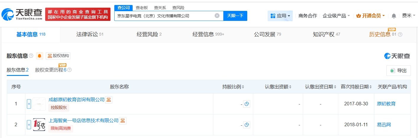 京东星宇电竞(北京)文化传播有限公司成立于2017年8月,法定代表人为蓝柏清,经营范围包括组织文化艺术交流活动、物业管理、计算机及通讯设备租赁等。股东信息显示,该公司由成都原初教育咨询有限公司、上海智奥一号店信息技术有限公司共同持股。