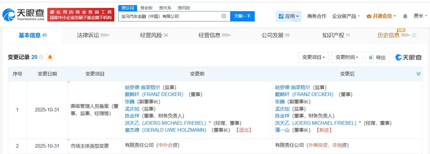 天眼查工商信息显示,近日,宝马汽车金融(中国)有限公司发生工商变更,霍杰德(GERALD UWE HOLZMANN)卸任董事长,由薄一山接任。