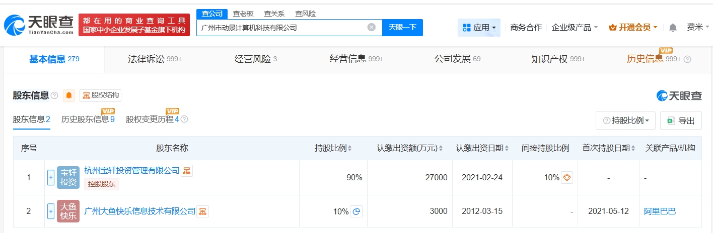 广州市动景计算机科技有限公司成立于2005年3月,法定代表人为王鑫,注册资本3亿人民币,经营范围包括软件服务、广告业、计算机零配件零售等。股东信息显示,该公司由杭州宝轩投资管理有限公司、广州大鱼快乐信息技术有限公司共同持股。据媒体报道,10月24日,阿里巴巴首款自研的夸克AI眼镜在天猫店铺首发。