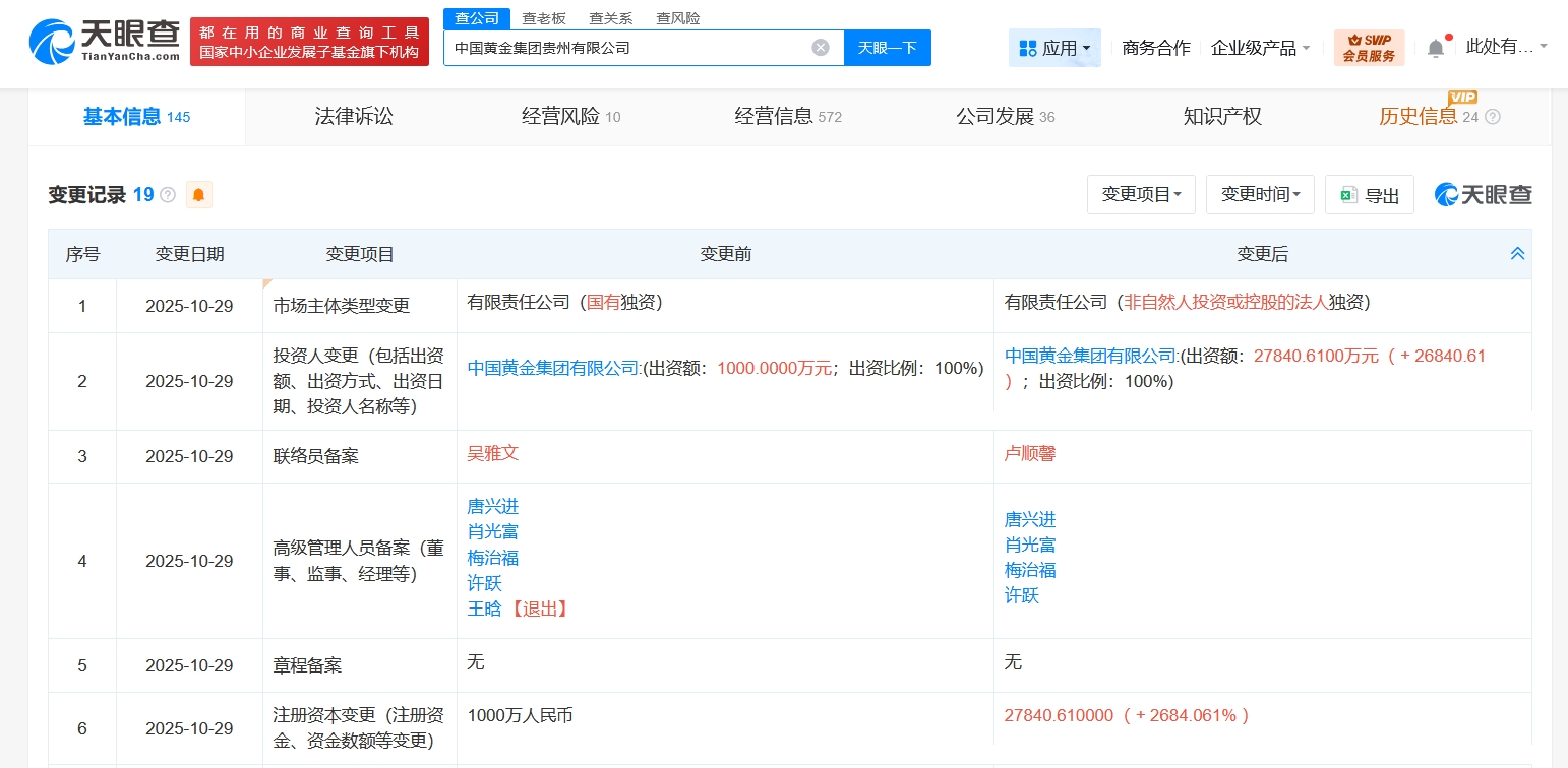 天眼查工商信息显示,近日,中国黄金集团贵州有限公司发生工商变更,注册资本由1000万人民币增至约2.8亿人民币,增幅约2684%。