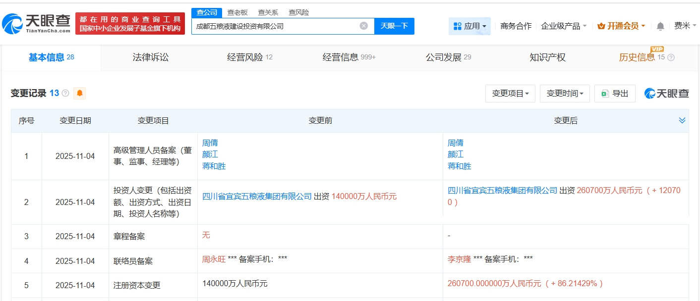 天眼查工商信息显示,近日,成都五粮液建设投资有限公司发生工商变更,注册资本由14亿人民币增至26.07亿人民币,增幅约86%。