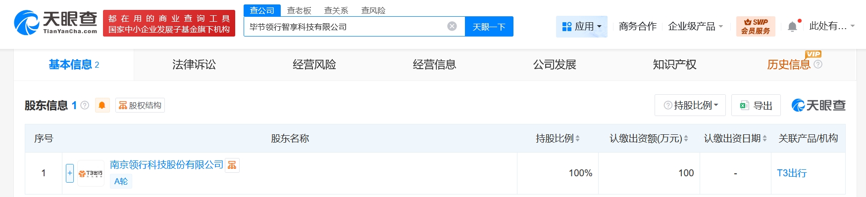天眼查工商信息显示,近日,毕节领行智享科技有限公司成立,法定代表人为刘思远,注册资本100万人民币,经营范围含网络预约出租汽车经营服务、企业管理、信息咨询服务、计算机软硬件及辅助设备批发、计算机软硬件及辅助设备零售、小微型客车租赁经营服务、汽车零配件零售、汽车零配件批发、新能源汽车电附件销售等。股东信息显示,该公司由T3出行关联公司南京领行科技股份有限公司全资持股。