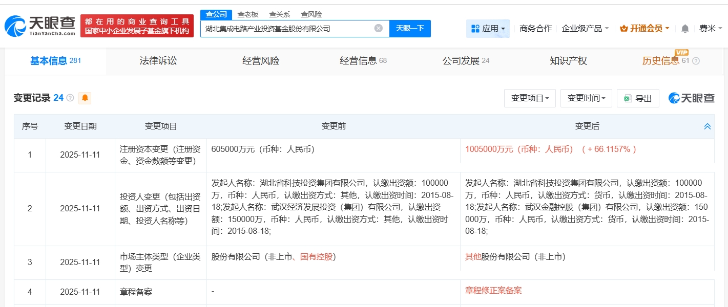 天眼查App显示,近日,湖北集成电路产业投资基金股份有限公司发生工商变更,注册资本由60.5亿人民币增至100.5亿人民币,增幅约66%。