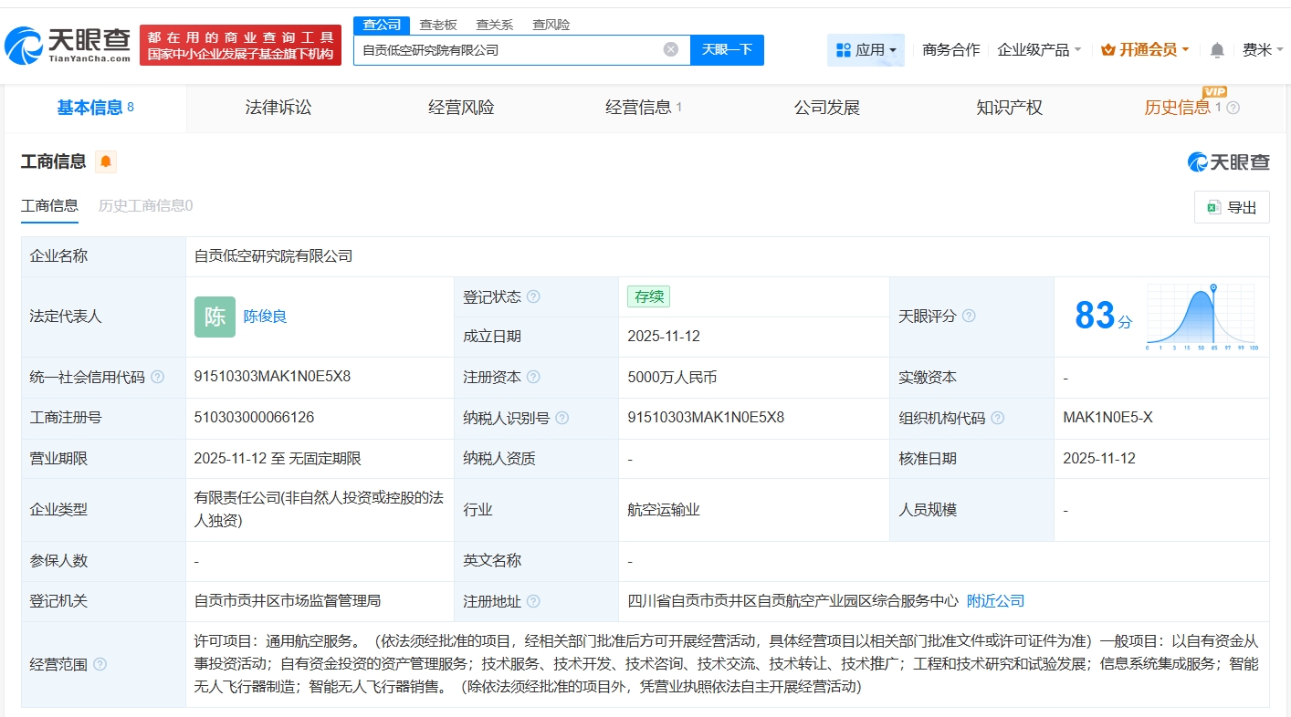 天眼查工商信息显示,近日,自贡低空研究院有限公司成立,法定代表人为陈俊良,注册资本5000万人民币,经营范围包括通用航空服务、以自有资金从事投资活动、自有资金投资的资产管理服务等。股东信息显示,该公司由自贡航空产业投资集团有限责任公司全资持股。