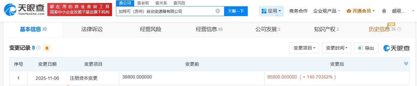 天眼查工商信息显示,近日,加特可(苏州)自动变速箱有限公司发生工商变更,注册资本由3.98亿人民币增至9.58亿人民币,增幅约141%。