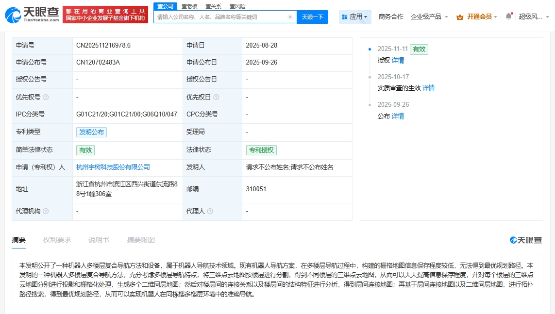 天眼查App显示,近日,宇树科技股份有限公司申请的“一种机器人多楼层复合导航方法和设备”专利获授权。