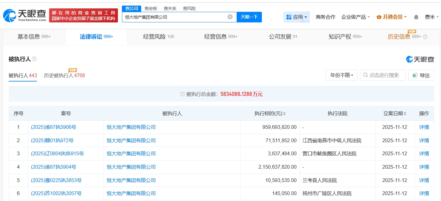 天眼查法律诉讼信息显示,11月12日,恒大地产集团有限公司新增6条被执行人信息,执行标的合计31.9亿余元,部分案件被执行人还包括重庆恒大鑫溉置业有限公司、南昌恒腾置业有限公司等,执行法院包括江西省南昌市中级人民法院、营口市鲅鱼圈区人民法院等。