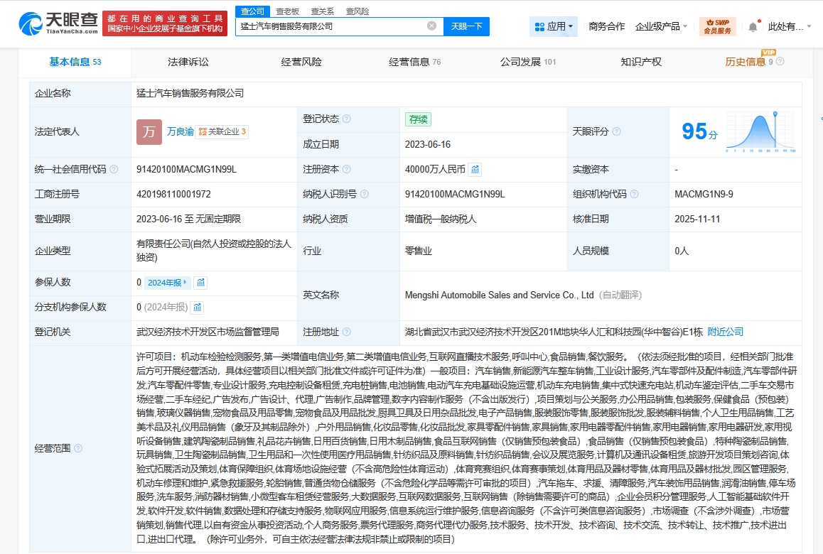 该公司成立于2023年6月,经营范围含机动车检验检测服务、互联网直播技术服务、汽车销售、新能源汽车整车销售、工业设计服务、汽车零部件及配件制造、汽车零部件研发、汽车零配件零售、专业设计服务等。股东信息显示,该公司由东风汽车集团股份有限公司全资持股。