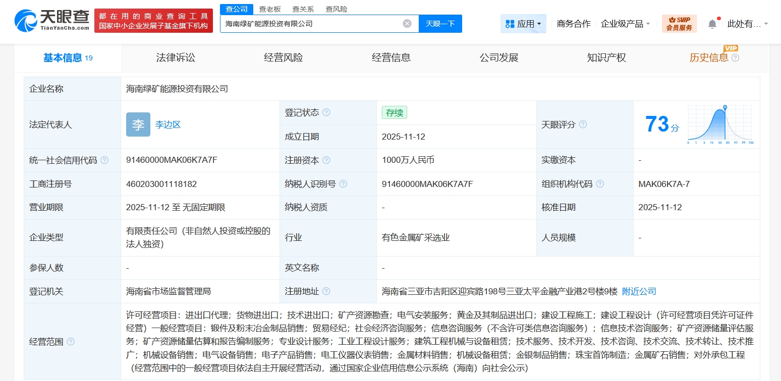 天眼查工商信息显示,近日,海南绿矿能源投资有限公司成立,法定代表人为李边区,注册资本1000万人民币,经营范围含进出口代理、货物进出口、技术进出口、矿产资源勘查、电气安装服务、黄金及其制品进出口、建设工程施工、建设工程设计、贸易经纪、社会经济咨询服务等。股东信息显示,该公司由特变电工(600089)全资持股。