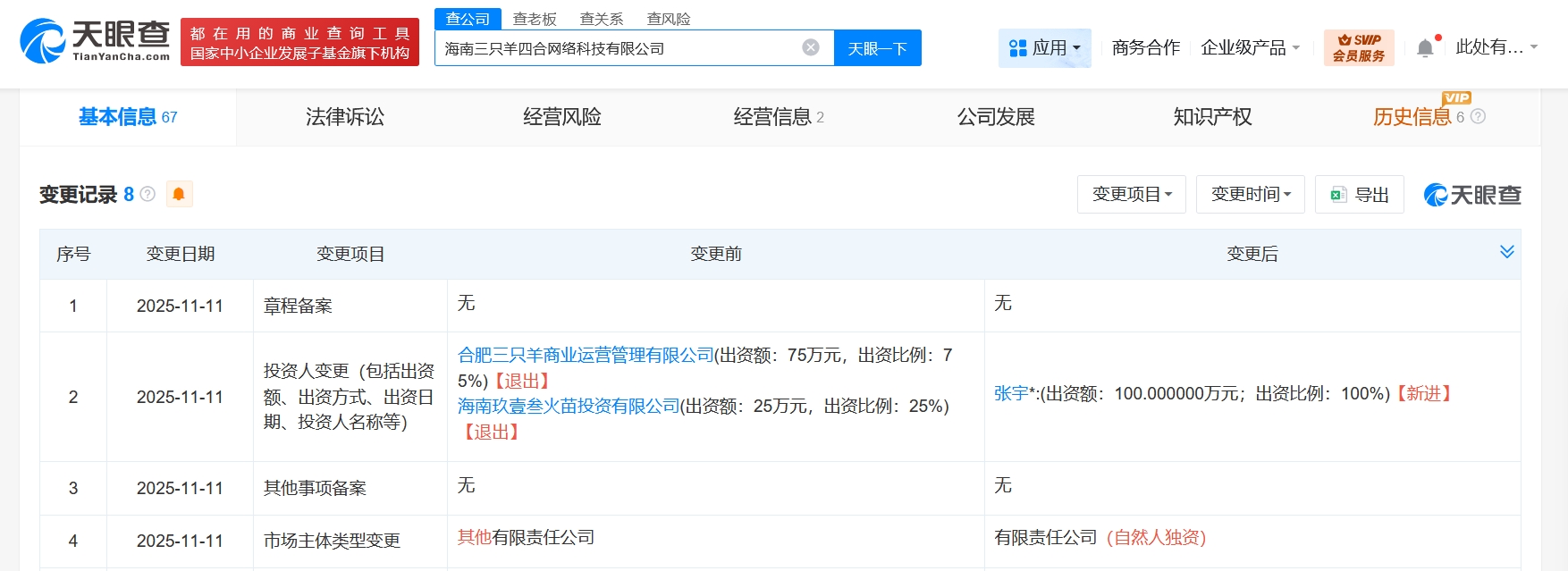 天眼查工商信息显示,近日,海南三只羊四合网络科技有限公司发生工商变更,三只羊商业运营管理有限公司、海南玖壹叁火苗投资有限公司退出股东行列,新增张宇为股东并全资持股。
