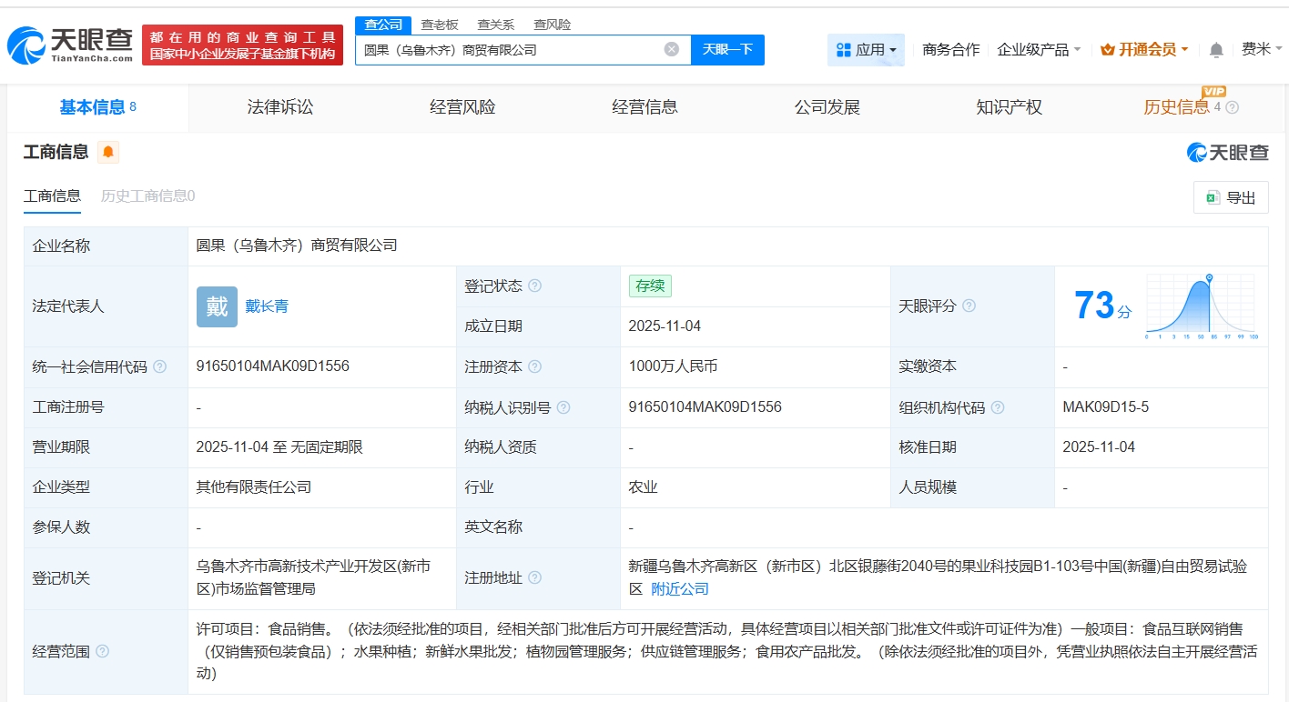 天眼查工商信息显示,近日,圆果(乌鲁木齐)商贸有限公司成立,法定代表人为戴长青,注册资本1000万人民币,经营范围包括食品销售、食品互联网销售、水果种植等。股东信息显示,该公司由圆通速递有限公司、新疆果业集团有限公司、青田中智物产贸易有限公司共同持股。