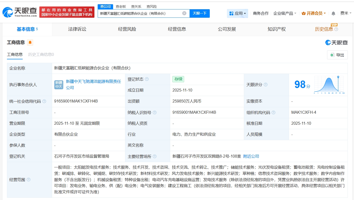 天眼查工商信息显示,近日,新疆天富融汇低碳能源合伙企业(有限合伙)成立,执行事务合伙人为新疆中天飞驰清洁能源有限责任公司,出资额约26亿人民币,经营范围包括太阳能发电技术服务、储能技术服务、光伏发电设备租赁等。合伙人信息显示,该合伙企业由天富能源(600509)及旗下新疆中天飞驰清洁能源有限责任公司、中国康富(833499)共同出资。