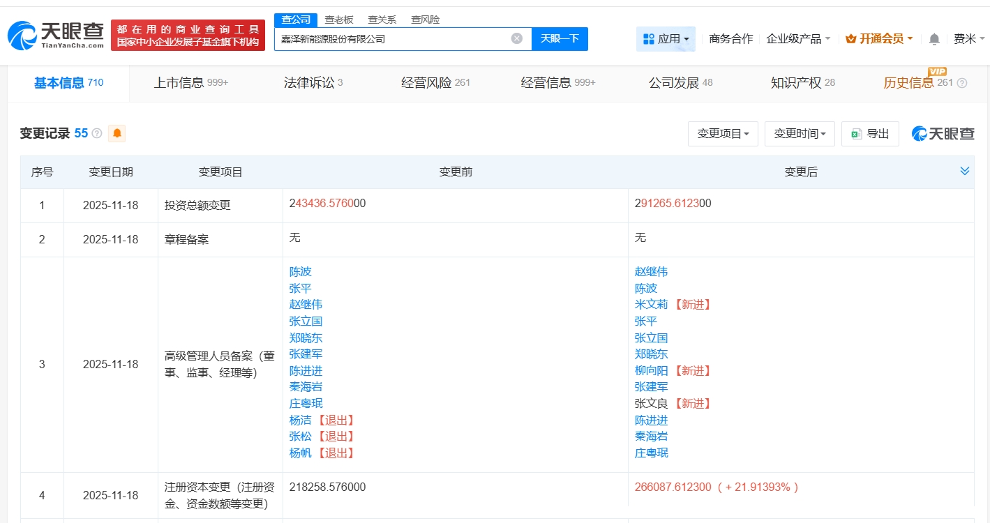 天眼查App显示,近日,嘉泽新能(601619)发生工商变更,注册资本由约24.3亿人民币增至约29.1亿人民币,同时多位高管发生变更。
