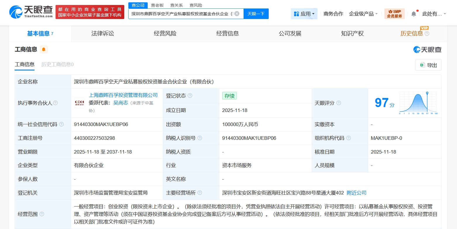 天眼查工商信息显示,近日,深圳市鼎晖百孚空天产业私募股权投资基金合伙企业(有限合伙)成立,执行事务合伙人为上海鼎晖百孚投资管理有限公司,出资额10亿人民币,经营范围为创业投资,以私募基金从事股权投资、投资管理、资产管理等活动。合伙人信息显示,该基金由深圳市引导基金投资有限公司、天津鼎晖骏骅股权投资合伙企业(有限合伙)、深圳市宝安区产业投资引导基金有限公司、上海鼎晖百孚投资管理有限公司共同出资。
