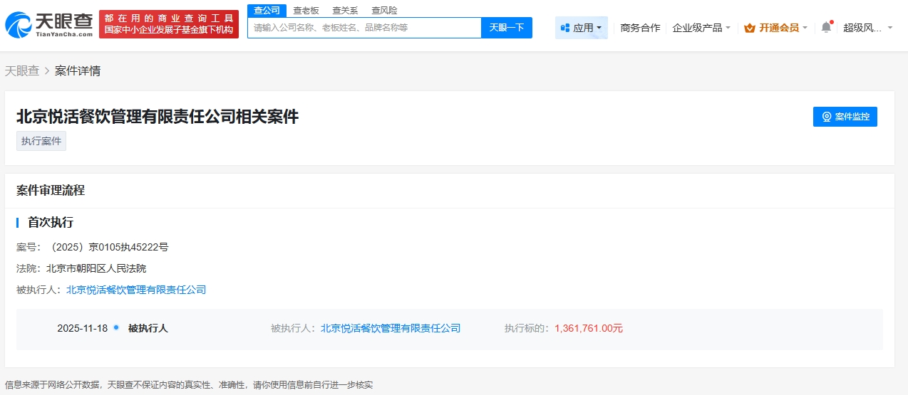 天眼查天眼风险信息显示,近日,网红酸奶Blueglass关联公司北京悦活餐饮管理有限责任公司新增2条被执行人信息,执行标的合计221万余元,其中一案件被执行人还包括上海悦活餐饮管理有限公司,执行法院均为北京市朝阳区人民法院。