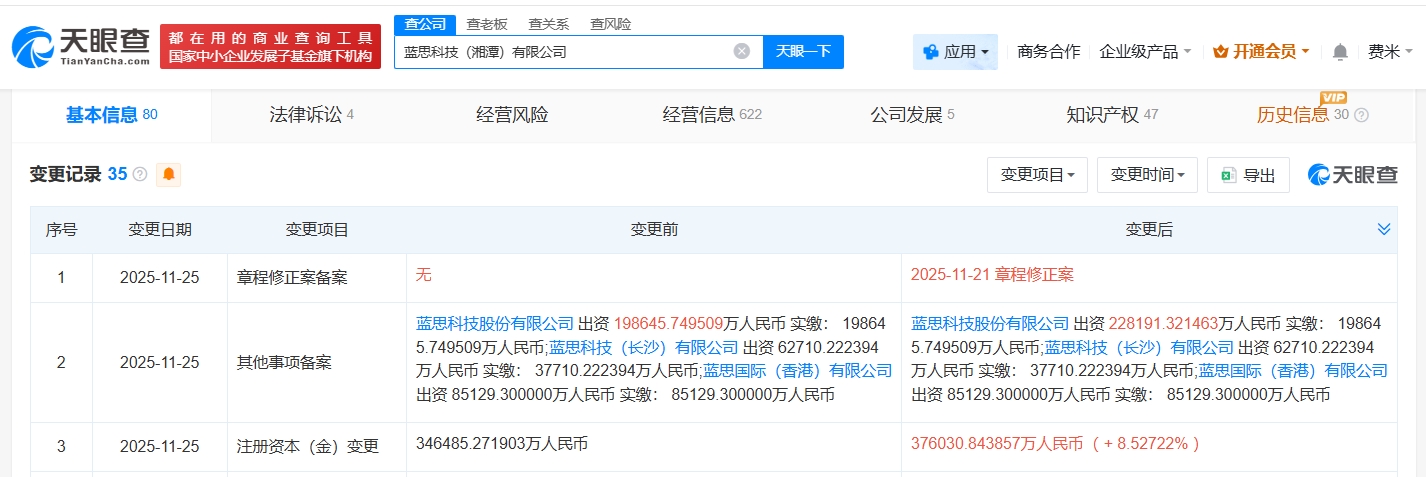 天眼查工商信息显示,近日,蓝思科技(湘潭)有限公司发生工商变更,注册资本由约34.65亿人民币增至约37.6亿人民币,增幅约9%。