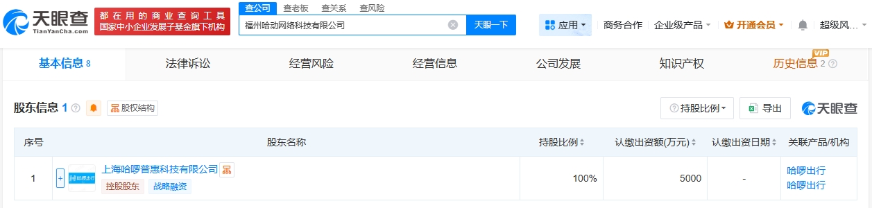 天眼查App显示,近日,福州哈动网络科技有限公司成立,法定代表人为邢成,注册资本5000万人民币,经营范围包括科技推广和应用服务、软件开发、物联网应用服务、电动汽车充电基础设施运营等。股东信息显示,该公司由上海哈啰普惠科技有限公司全资持股。
