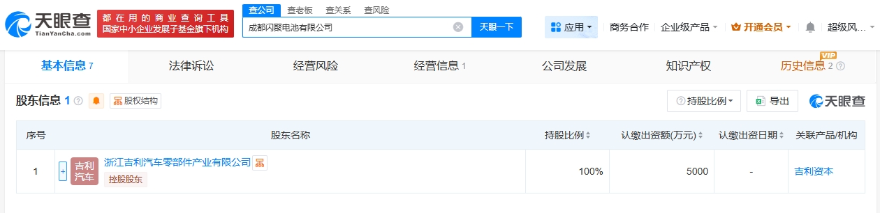 天眼查App显示,近日,成都闪聚电池有限公司成立,法定代表人为任向飞,注册资本5000万人民币,经营范围包括电池销售、电池制造、电池零配件生产、电池零配件销售等。股东信息显示,该公司由浙江吉利汽车零部件产业有限公司全资持股。