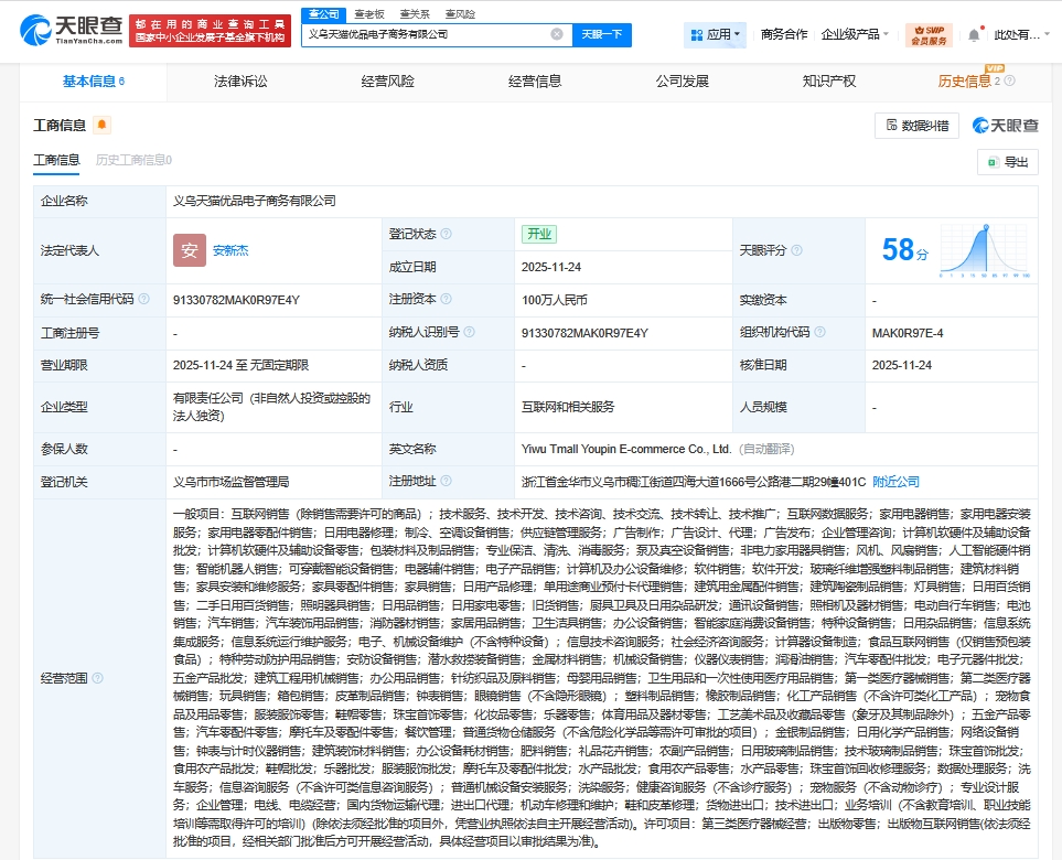 天眼查工商信息显示,近日,义乌天猫优品电子商务有限公司成立,法定代表人为安新杰,注册资本100万人民币,经营范围含互联网销售、互联网数据服务、家用电器销售、家用电器安装服务、家用电器零配件销售、供应链管理服务、企业管理咨询、计算机软硬件及辅助设备批发等。股权全景穿透图显示,该公司由淘天有限公司全资持股,后者为淘宝(中国)软件有限公司全资子公司。