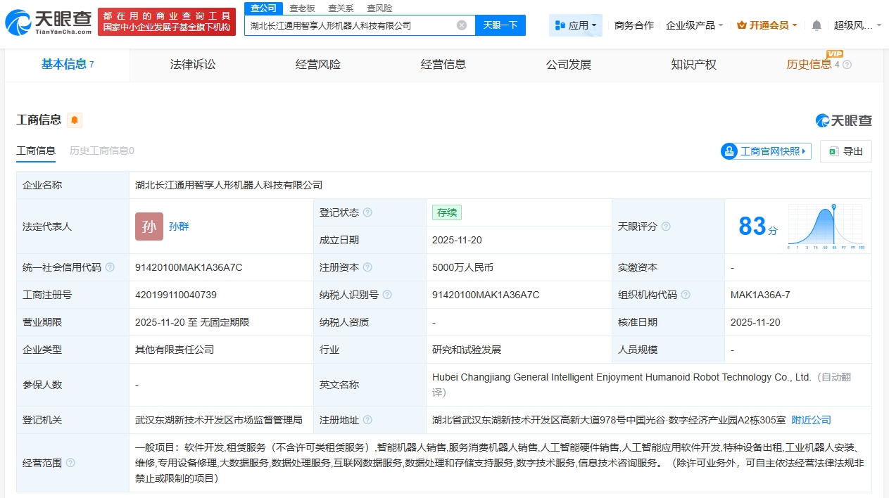 天眼查App显示,近日,湖北长江通用智享人形机器人科技有限公司成立,法定代表人为孙群,注册资本5000万人民币,经营范围包括软件开发、智能机器人销售、服务消费机器人销售等。股东信息显示,该公司由武汉光谷资产投资管理有限公司、湖北省人形机器人产业投资基金合伙企业(有限合伙)共同持股。